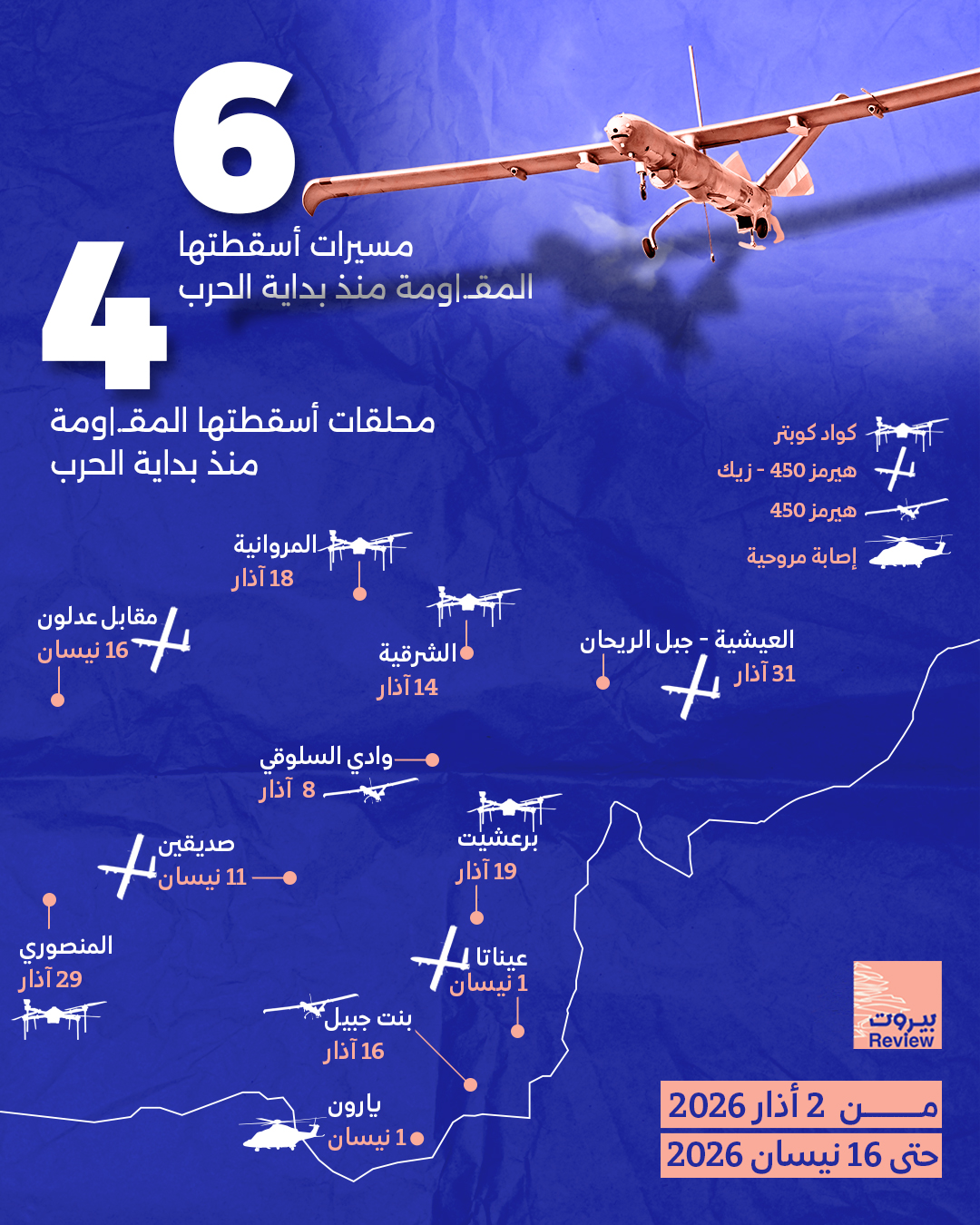 في المقابل، المقاومة كانت حاضرة للتصدي، وفعّلت دفاعاتها الجويّة لتعلن إسقاط 6 مسيّرات و4 محلقات إسرائيلية معادية جنوب لبنان بين 2 آذار و16 نيسان 2026.