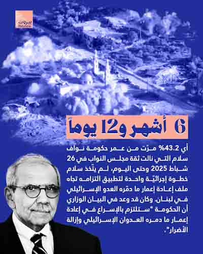6 أشهر و 12 يوماً مرّت على ولادة حكومة نوّاف سلام، ووعوده لا تزال حبرًا على ورق. فبيان الحكومة الوزاري الذي ألزمها “بالإسراع في إعادة إعمار ما دمره العدوان الإسرائيلي وإزالة الأضرار” بقي حتى الآن بلا تنفيذ، بل حتى دون بوادر للبدء بالخطوات الأولى باتجاه الإعمار.