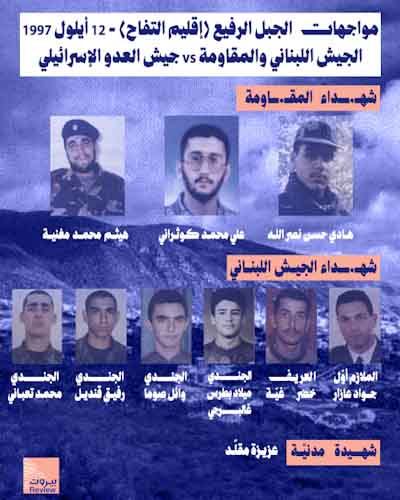 الجيش اللبناني والمقاومة vs جيش العدو الإسرائيليفي 12 أيلول 1997، خاضت المقاومة مع الجيش اللبناني مواجهةً بطوليةً ضد جيش الاحتلال الإسرائيلي في منطقة الجبل الرفيع في إقليم التفاح.