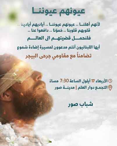 الدعوة مفتوحة للبنانيين للمشاركة في المسيرة دعمًا لمقاومي وجرحى “البيجر” الذين أصيبوا خلال المجزرة. وستُنظَّم المسيرة يوم الأربعاء 17 أيلول عند الساعة 7:30 مساءً، حيث سيكون التجمع في دوّار العلم بمدينة صور، في خطوة تهدف إلى تسليط الضوء على جراح ضحايا المجزرة، ونقل صوتهم إلى الرأي العام المحلي والعالمي.