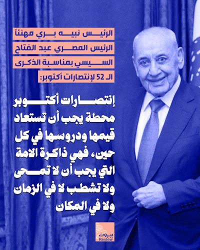 وجّه رئيس مجلس النواب نبيه بري رسالة تهنئة إلى الرّئيس المصري عبد الفتّاح السّيسي بمناسبة الذّكرى الـ52 لإنتصارات أكتوبر.