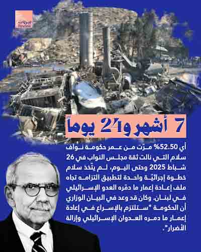 7 أشهر و 24 يوماً مرّت على ولادة حكومة نوّاف سلام، ووعوده لا تزال حبرًا على ورق. فبيان الحكومة الوزاري الذي ألزمها “بالإسراع في إعادة إعمار ما دمره العدوان الإسـرائيلي وإزالة الأضرار” بقي حتى الآن بلا تنفيذ، بل حتى دون بوادر للبدء بالخطوات الأولى باتجاه الإعمار.