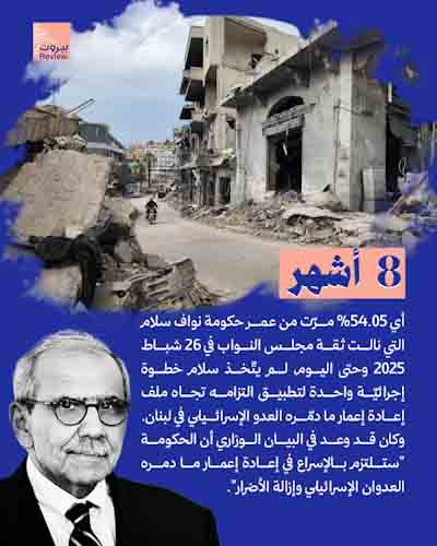 8 أشهر مرّت على ولادة حكومة نوّاف سلام، ووعوده لا تزال حبرًا على ورق. فبيان الحكومة الوزاري الذي ألزمها "بالإسراع في إعادة إعمار ما دمره العدوان الإسرائيلي وإزالة الأضرار" بقي حتى الآن بلا تنفيذ، بل حتى دون بوادر للبدء بالخطوات الأولى باتجاه الإعمار.