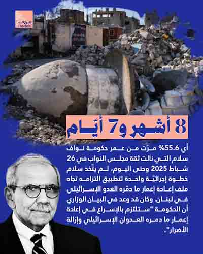 8 أشهر و ٧ أيّام مرّت على ولادة حكومة نوّاف سلام، ووعوده لا تزال حبرًا على ورق. فبيان الحكومة الوزاري الذي ألزمها “بالإسراع في إعادة إعمار ما دمره العدوان الإسرائيلي وإزالة الأضرار” بقي حتى الآن بلا تنفيذ، بل حتى دون بوادر للبدء بالخطوات الأولى باتجاه الإعمار.