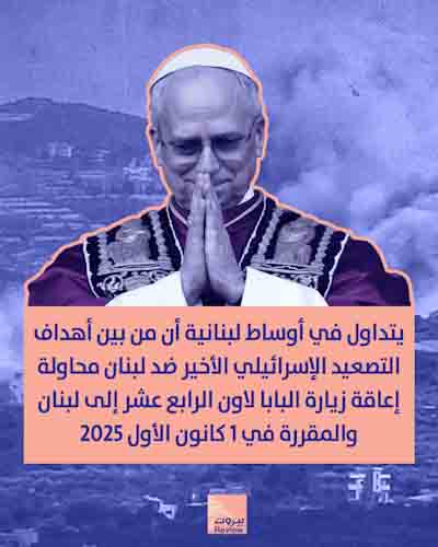 موضوعات 2025-11-10 تصعيد إسرائيلي منعًا لزيارة البابا لاون الرابع عشر إلى لبنان! يتداول في أوساط لبنانية أن من بين أهداف التصعيد الإسرائيلي الأخير ضد لبنان محاولة إعاقة زيارة البابا لاون الرابع عشر إلى لبنان والمقررة في 1 كانون الأول 2025 .IMG_7304.jpeg 64.56 KB