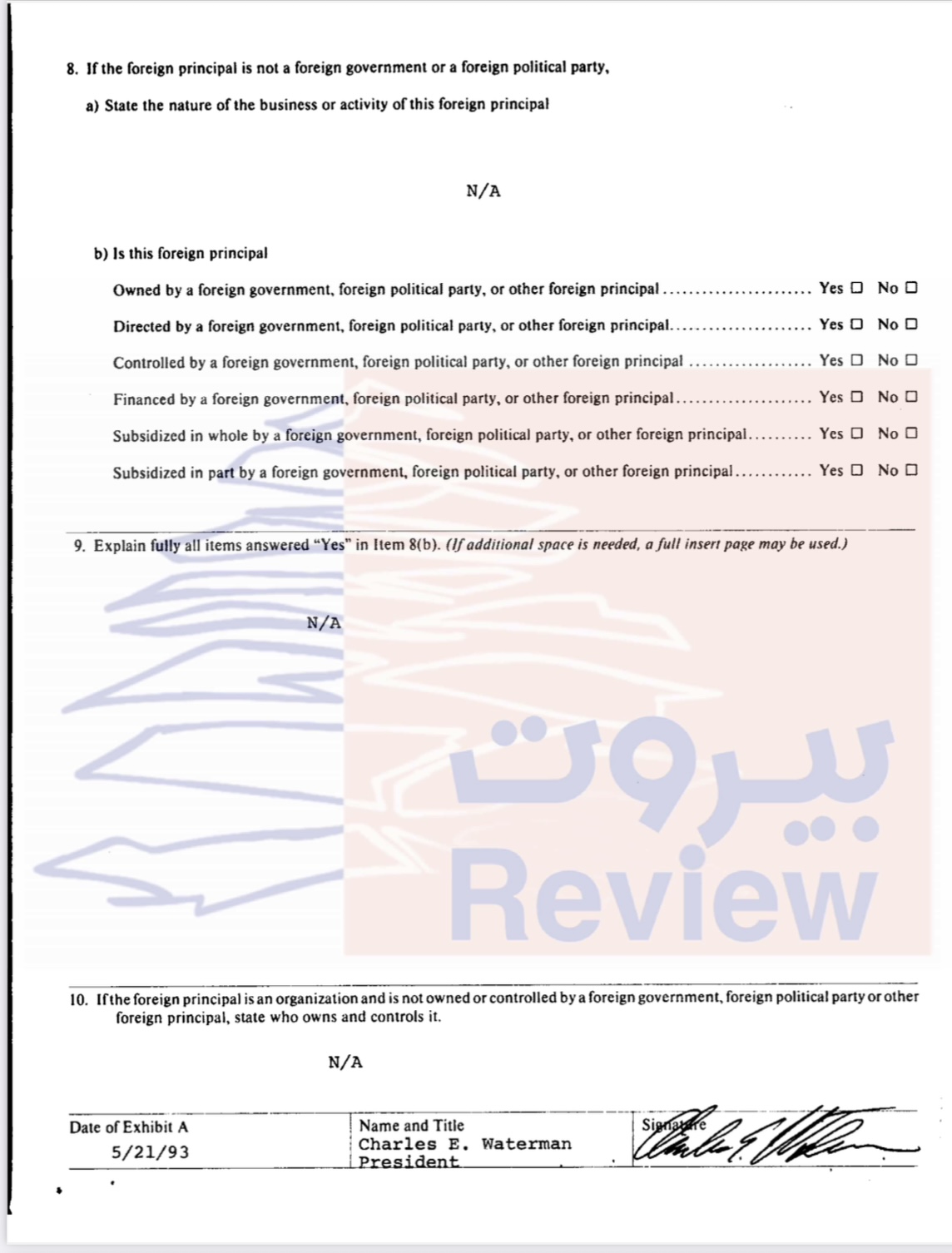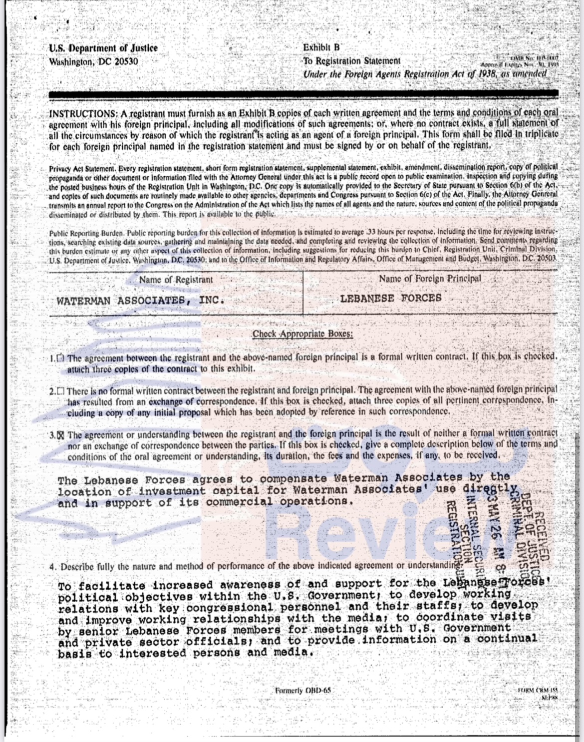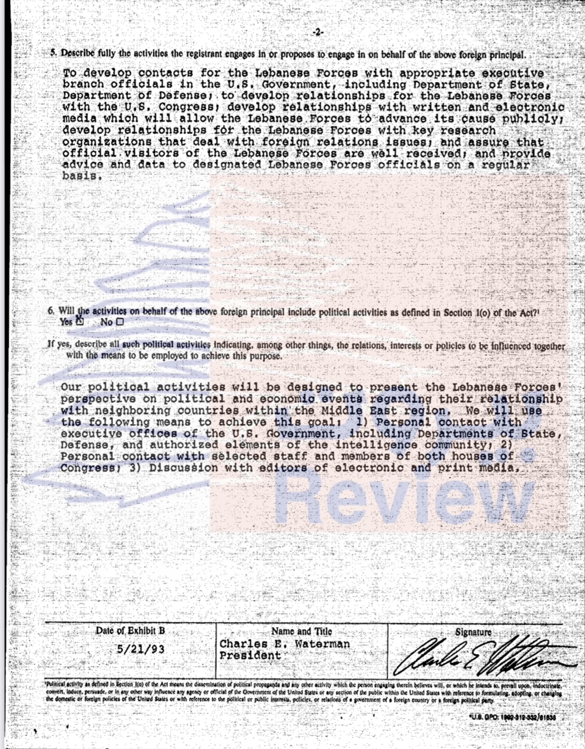 استمرّت القوات بمحاولة التأثير على التوجّهات الأميركية في لبنان، ففي أيار 1993 سُجّلت وثيقة رسمية صادرة بموجب قانون FARA نصّت على أن «Waterman Associates, Inc.» — وهي شركة ضغط واسعة الصلات في العاصمة الأميركية — باشرت بتمثيل «القوات اللبنانية» بصورة مباشرة. وقد استمر هذا التمثيل حتى 31 كانون الأول 1994، وهو ما يظهر جلياً في وثيقة تحمل تاريخ 26 أيار 1993، وتُسجّل القوات كعميل أجنبي رسمي للشركة. ما تكشفه الوثيقة المفصّلة الصادرة في نهاية عام 1994، والتي تُعدّ الأغنى في مضمونها، هو حجم العمل الذي قامت به الشركة نيابة عن القوات، فقد عقدت لقاءات واجتماعات مع أعضاء من الكونغرس الأميركي، وفتحت قنوات تواصل مع موظفي اللجان المعنية بالشؤون الخارجية، إضافة إلى لقاءات متكرّرة مع مسؤولين في وزارة الخارجية الأميركية لمناقشة ما تصفه الوثيقة بـ«الوجود السوري في لبنان» و«دور لبنان في عملية السلام». وكانت الشركة تُعدّ رسائل ومقالات وتحليلات تُرسل إلى الإعلام الأميركي بهدف نقل «رواية القوات» عمّا يجري في لبنان.