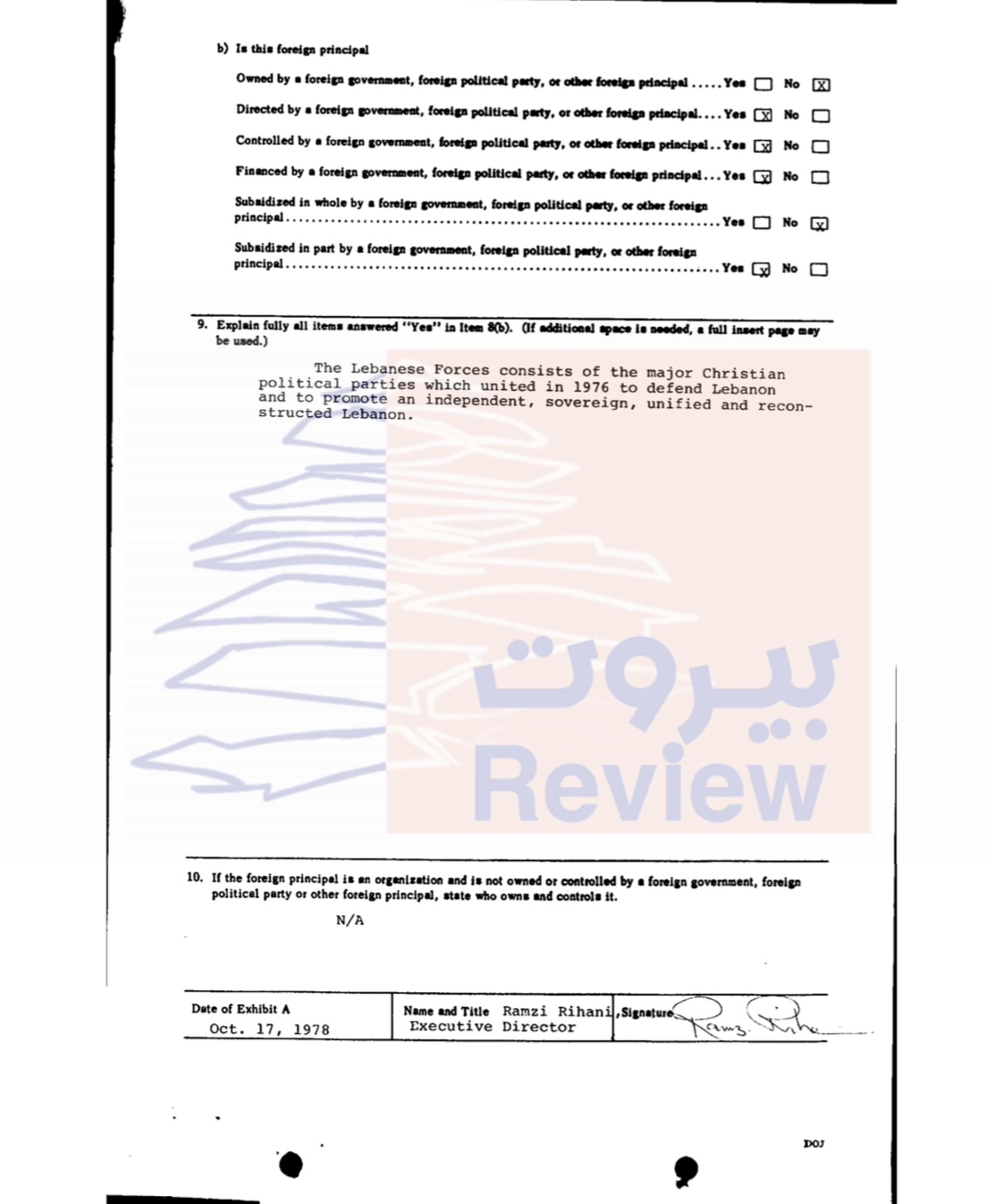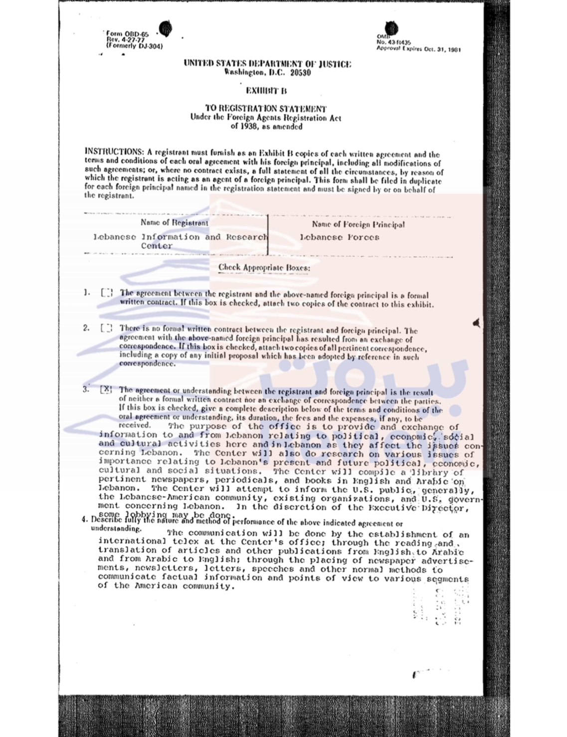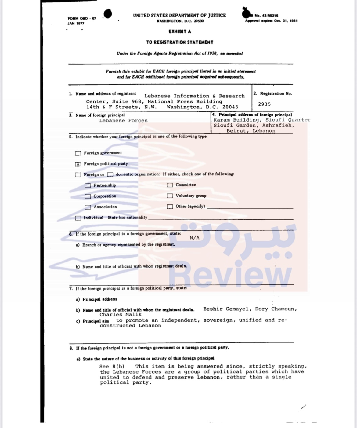 الوثيقة الأولى تعود إلى تاريخ 27 تموز 1978، عندما سُجّل في الولايات المتحدة ما يسمى «المركز اللبناني للإعلام والأبحاث» (Lebanese Information & Research Center) كجهة تعمل في واشنطن باسم شخصيات لبنانية، ولكن سرعان ما أصبحت «القوات اللبنانية» هي «الجهة الأجنبية» الرسمية التي يمثّلها هذا المركز. وتشير وثيقة أخرى صادرة في تشرين الأول من العام نفسه إلى تسجيل القوات اللبنانية نفسها كـ«Foreign Principal» لدى المركز المذكور، وهو تعبير قانوني يعني ببساطة أن المركز بات يعمل كذراع إعلامية وسياسية لصالح القوات داخل الولايات المتحدة. في تلك المرحلة، لم تكن الحرب اللبنانية قد بلغت ذروتها بعد، ولم يكن اسم «اللوبي» قد دخل الأدبيات اللبنانية، لكن القوات كانت تبني منذ ذلك الحين شبكة اتصالات دائمة مع الإعلام الأميركي، ومع موظفين في الكونغرس ولجانه، ومع دوائر الشؤون الخارجية في إدارات متعاقبة.