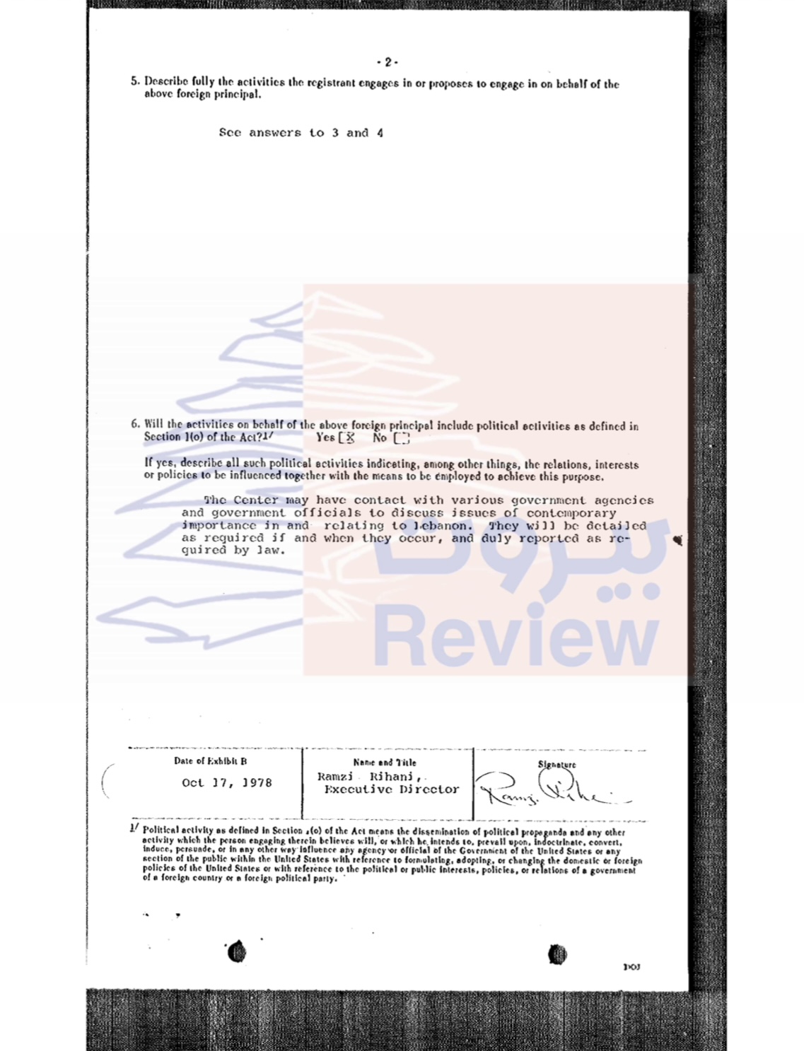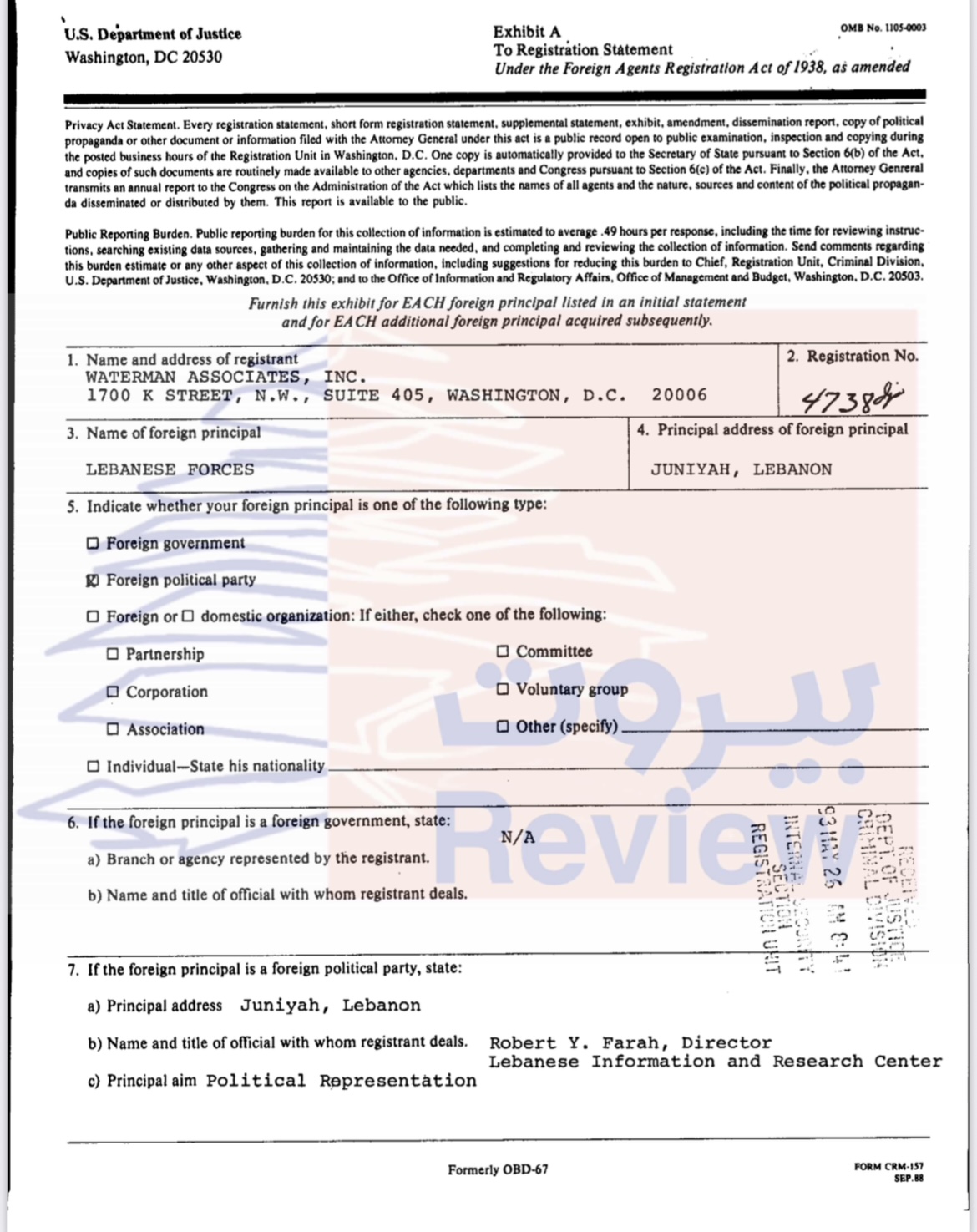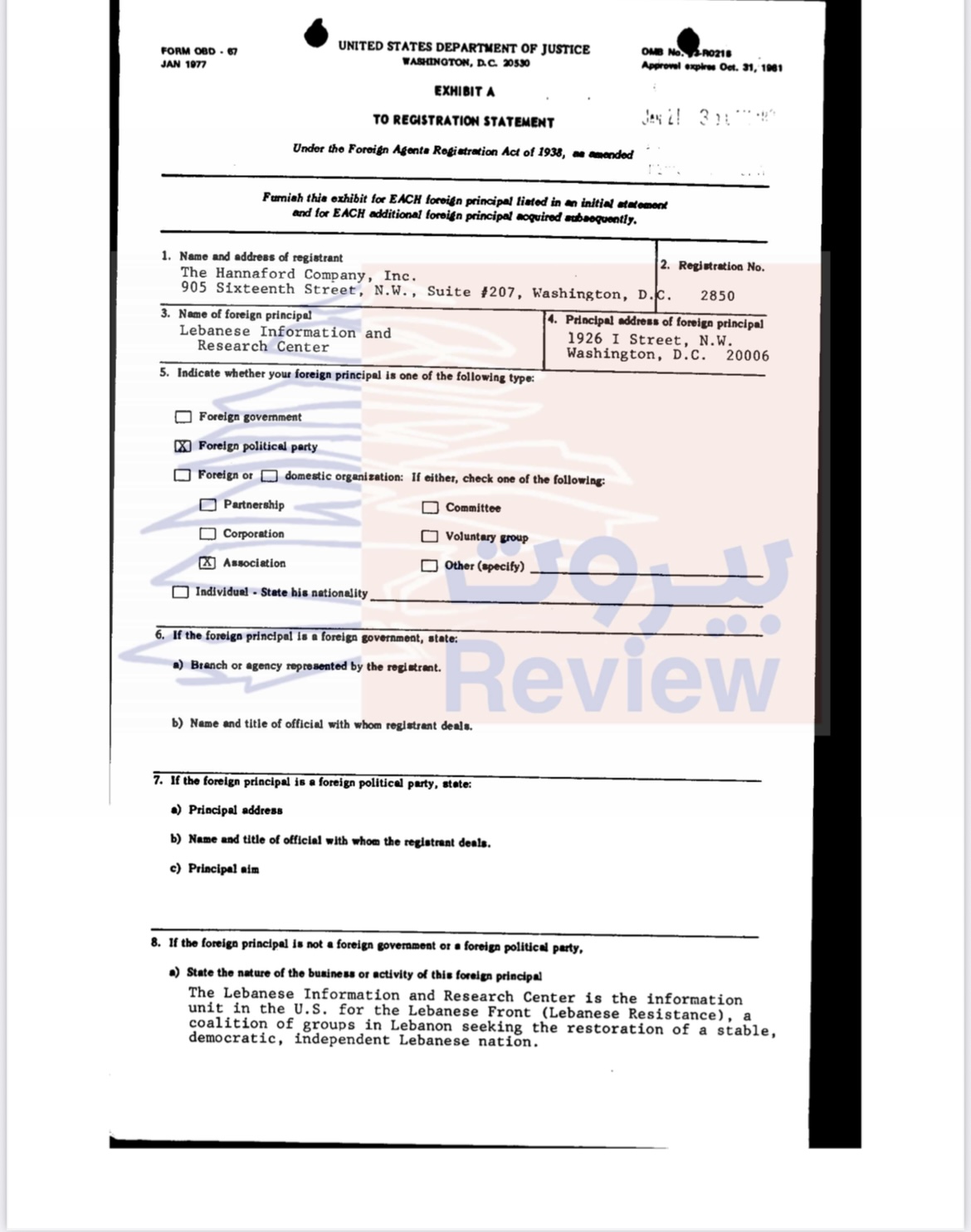 الوثيقة الأولى تعود إلى تاريخ 27 تموز 1978، عندما سُجّل في الولايات المتحدة ما يسمى «المركز اللبناني للإعلام والأبحاث» (Lebanese Information & Research Center) كجهة تعمل في واشنطن باسم شخصيات لبنانية، ولكن سرعان ما أصبحت «القوات اللبنانية» هي «الجهة الأجنبية» الرسمية التي يمثّلها هذا المركز. وتشير وثيقة أخرى صادرة في تشرين الأول من العام نفسه إلى تسجيل القوات اللبنانية نفسها كـ«Foreign Principal» لدى المركز المذكور، وهو تعبير قانوني يعني ببساطة أن المركز بات يعمل كذراع إعلامية وسياسية لصالح القوات داخل الولايات المتحدة. في تلك المرحلة، لم تكن الحرب اللبنانية قد بلغت ذروتها بعد، ولم يكن اسم «اللوبي» قد دخل الأدبيات اللبنانية، لكن القوات كانت تبني منذ ذلك الحين شبكة اتصالات دائمة مع الإعلام الأميركي، ومع موظفين في الكونغرس ولجانه، ومع دوائر الشؤون الخارجية في إدارات متعاقبة.