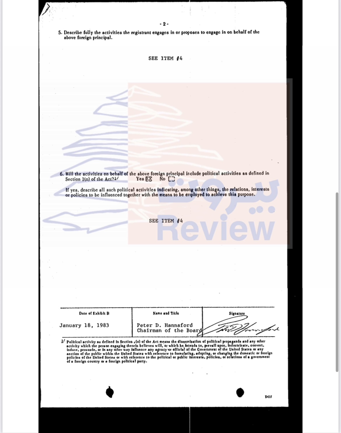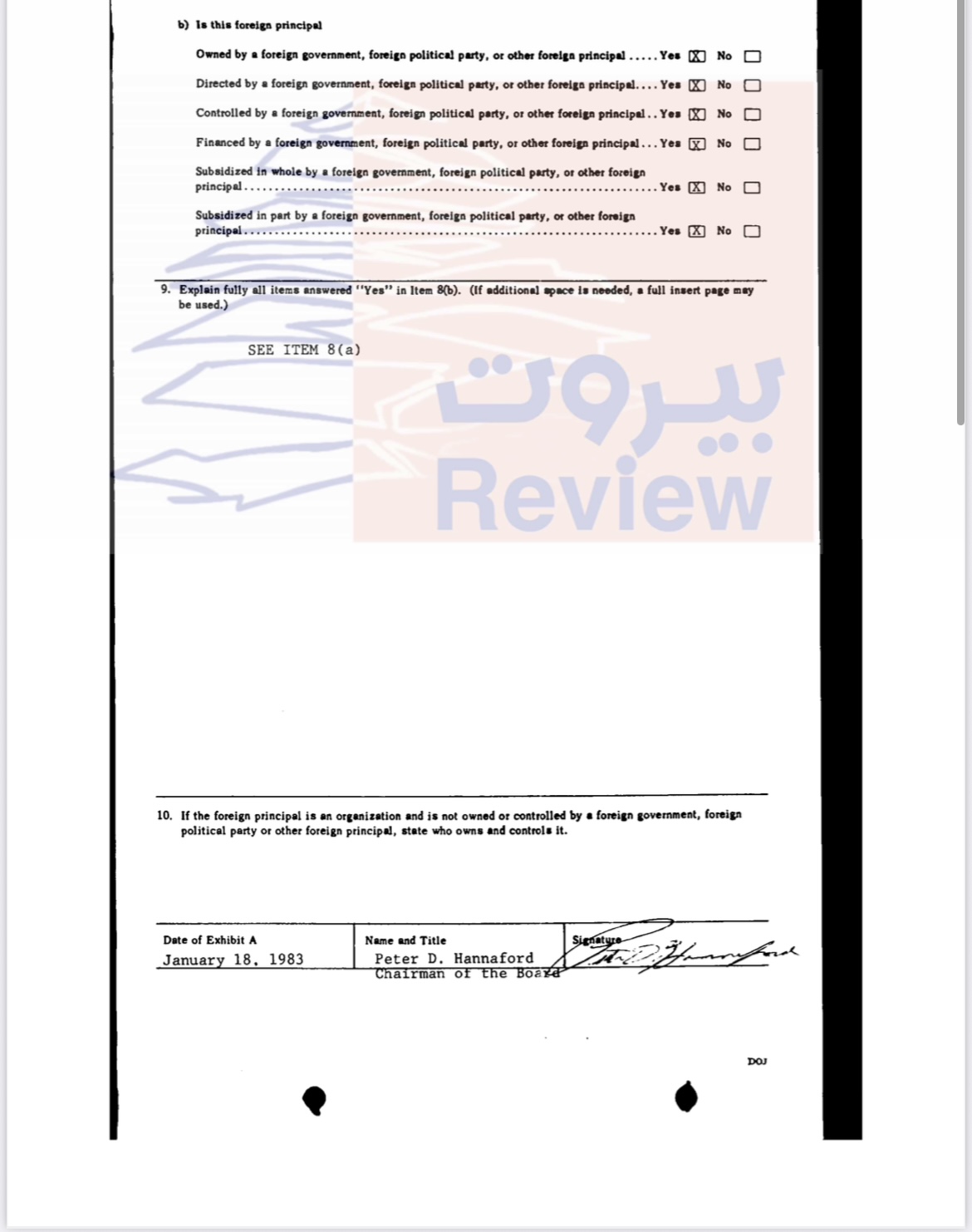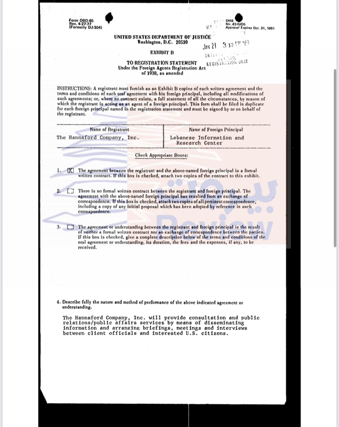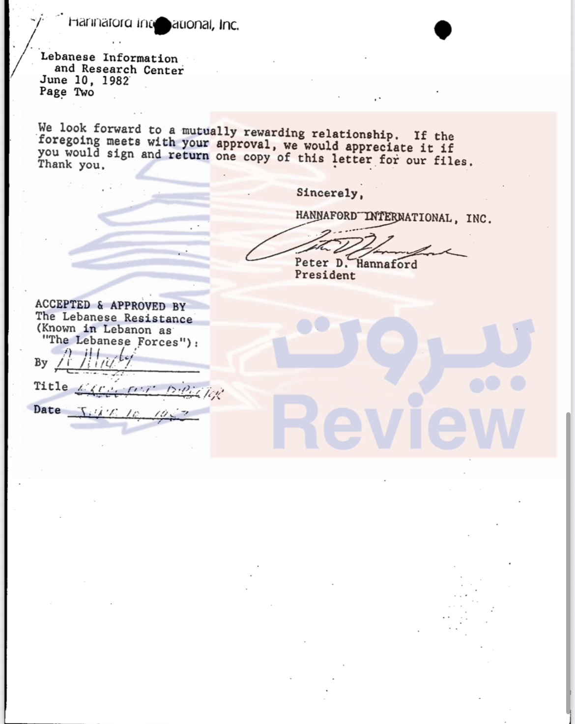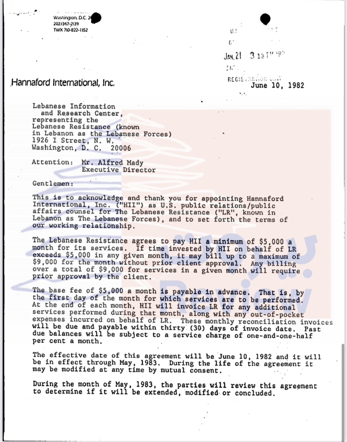 ولم يتوقف هذا المسار عند حدود ذلك المركز البحثي، إذ تُظهر وثيقة تعود إلى كانون الثاني 1983 توقيع علاقة رسمية بين «Deaver & Hannaford» — وهي واحدة من أبرز شركات الضغط الأميركية القريبة من إدارة الرئيس رونالد ريغان — وبين «Lebanese Information & Research Center». في تلك المرحلة الحساسة من تاريخ لبنان، عقب الاجتياح الإسرائيلي لبيروت وانخراط الإدارة الأميركية عسكرياً وسياسياً في البلد، كانت القوات تسعى إلى نقل رؤيتها للأحداث إلى واشنطن التي تتضمّن رؤيتها للعلاقة مع سوريا، وللمواجهة مع منظمة التحرير الفلسطينية، وللتركيبة السياسية اللبنانية. كان الهدف واضحاً، وهو التأثير على مواقف الإدارة الأميركية وإقناعها بأن القوات تمثّل «الطرف الموثوق» داخل الساحة اللبنانية، وأن النفوذ السوري يجب أن يُنظر إليه بوصفه تهديداً استراتيجياً للمصالح الأميركية نفسها.